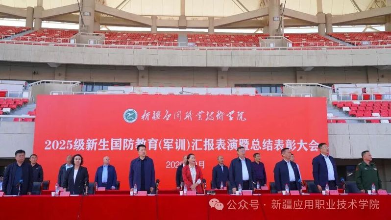 金秋九月,硕果飘香。9月29日16时,奎屯市体育中心内旌旗飘扬、掌声雷动,新疆应用职业技术学院2025级新生国防教育汇报表演暨总结表彰大会在此隆重举行。学院党委书记陈梅兰,学院党委副书记、院长叶列吾别克·那克斯别克,学院党委班子成员,奎屯市人民武装部副部长刘振华,各二级学院负责人,2025级辅导员、班主任及全体新生共同见证这一青春盛典。大会由学院党委副书记、院长叶列吾别克・那克斯别克主持。