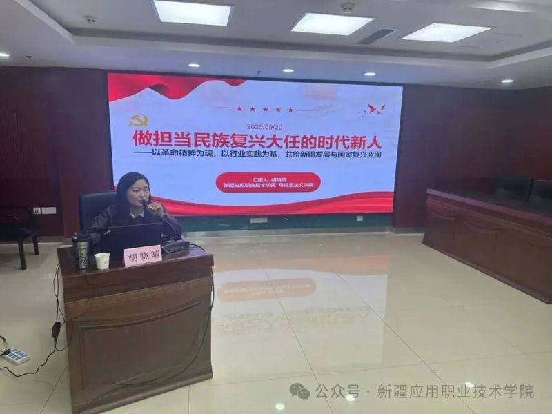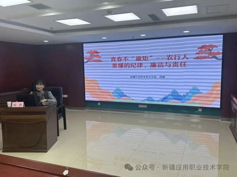 为深入贯彻落实习近平总书记关于“办好思政课,最根本的是要全面贯彻党的教育方针”的重要指示精神,充分发挥思政课教师服务社会发展、传播党的创新理论的重要作用。近日,在新疆应用职业技术学院马克思主义学院党总支的引领下,该院思政课教师胡晓晴、闻静受邀前往中国农业银行股份有限公司胡杨河兵团分行,以“做担当民族复兴大任的时代新人—以革命精神为魂,以行业实践为基,共绘新疆发展与国家复兴蓝图”“青春不‘逾矩’:农行人要懂的纪律、廉洁与责任”为题,为分行入党积极分子开展专题培训讲座,推动党的理论学习与行业实践深度融合。