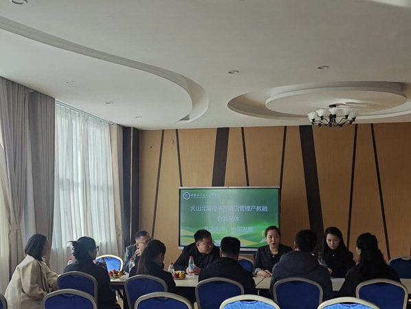 近日,天山北坡经济带酒店管理产教融合共同体第一届第三次理事会暨 2025年年会的企业座谈专场,在新疆应用职业技术学院实训室西餐实训室热烈开展。出席会议的有奎屯天悦假日有限责任公司魏波总经理、奎屯宾馆都昕负责人等八家企业代表,园林与旅游管理学院副院长王环环、酒店管理教研室主任瞿燕及专任教师佟燕茹深度对话,围绕校企合作的痛点、难点与突破点,开启了一场关乎酒店管理专业人才培养与行业发展的头脑风暴。