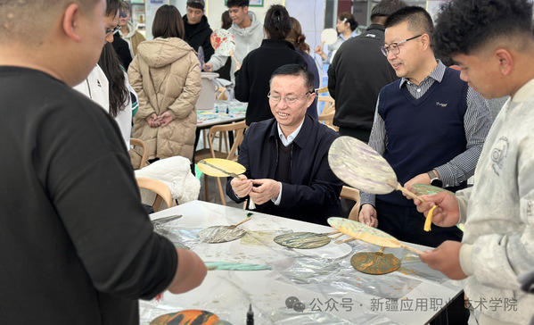 本次活动由艺术学院党总支、分团委主办,紧扣“民族团结、师生融情”为核心主题,大家手持漆扇尽情挥洒创意,以漆扇为载体表达思绪——有的绘出新疆风光,有的以色彩抒发心情,有的借传统元素传递团结奋进的心声。学院党委委员、宣传部部长卡吾孜亚提·斯德克深入各小组,与学生一同调试颜料、构思图案、交流创作心得,手把手的指导、心贴心的畅谈,让师生情谊在创作中升温,民族团结的种子在互动中萌芽。