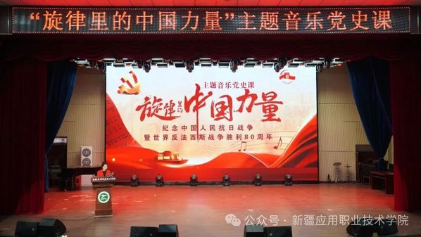 活动现场座无虚席,新疆应用职业技术学院的同学们专注聆听,眼神中满是认真与动容。课堂以经典抗战歌曲、电影片段为纽带,搭配主持人的现场讲述,串联起抗战时期的党史重大事件——舞台大屏上的历史影像与旋律交织,让厚重的党史故事以更生动的形式走进青年心中。