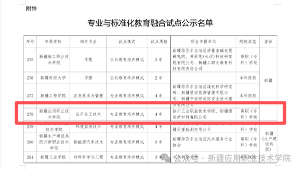近日,国家市场监管总局与教育部联合印发《关于专业与标准化教育融合试点名单的公示》,学院依托深厚的办学底蕴与创新的人才培养理念,应用化工技术专业成功跻身国家级试点行列。