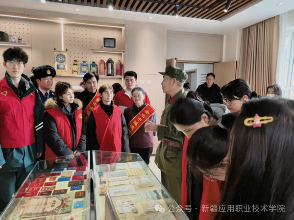 活动的第一站,志愿者们来到了鹏程园红色展厅。在这个收藏着城市记忆的小小空间里,常青藤宣讲队的骨干——大家亲切称呼的“韩叔叔”,为同学们带来了一堂生动的“行走的思政课”。在韩叔叔的指引下,同学们的目光被展柜里一件件珍贵的“老物件”深深吸引:1985年的教材、年代久远的藏书、粮票、钱币与老照片、毛主席像与雷锋旧照片。韩叔叔结合这些藏品,深情讲述了奎屯市这几年的飞速发展。从曾经的戈壁驿站到如今的丝路新城,同学们在一件件实物前驻足聆听,深刻感悟到雷锋精神与红色基因在这片土地上的交融共生。