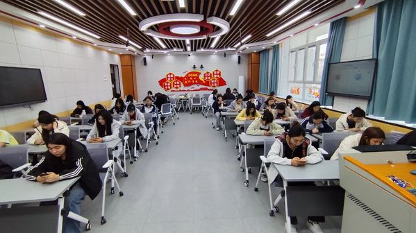 活动现场,在教师有序组织下,进入决赛的学生通过学习通平台展开线上竞答。大家认真思考、精准作答,展现出了积极向上的精神风貌。